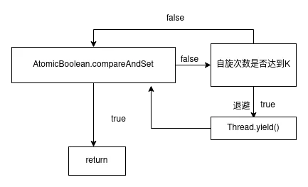 最终我们通过对自旋锁的行为建模,提出了 k 次退避锁:进行 K 次自旋后还未获得锁后,执行 Thread.yield() 将 CPU 执行权交给操作系统。这种行为能够避免互斥锁的无谓上下文切换,也能避免高压场景下的无限自旋带来的 CPU 损耗。