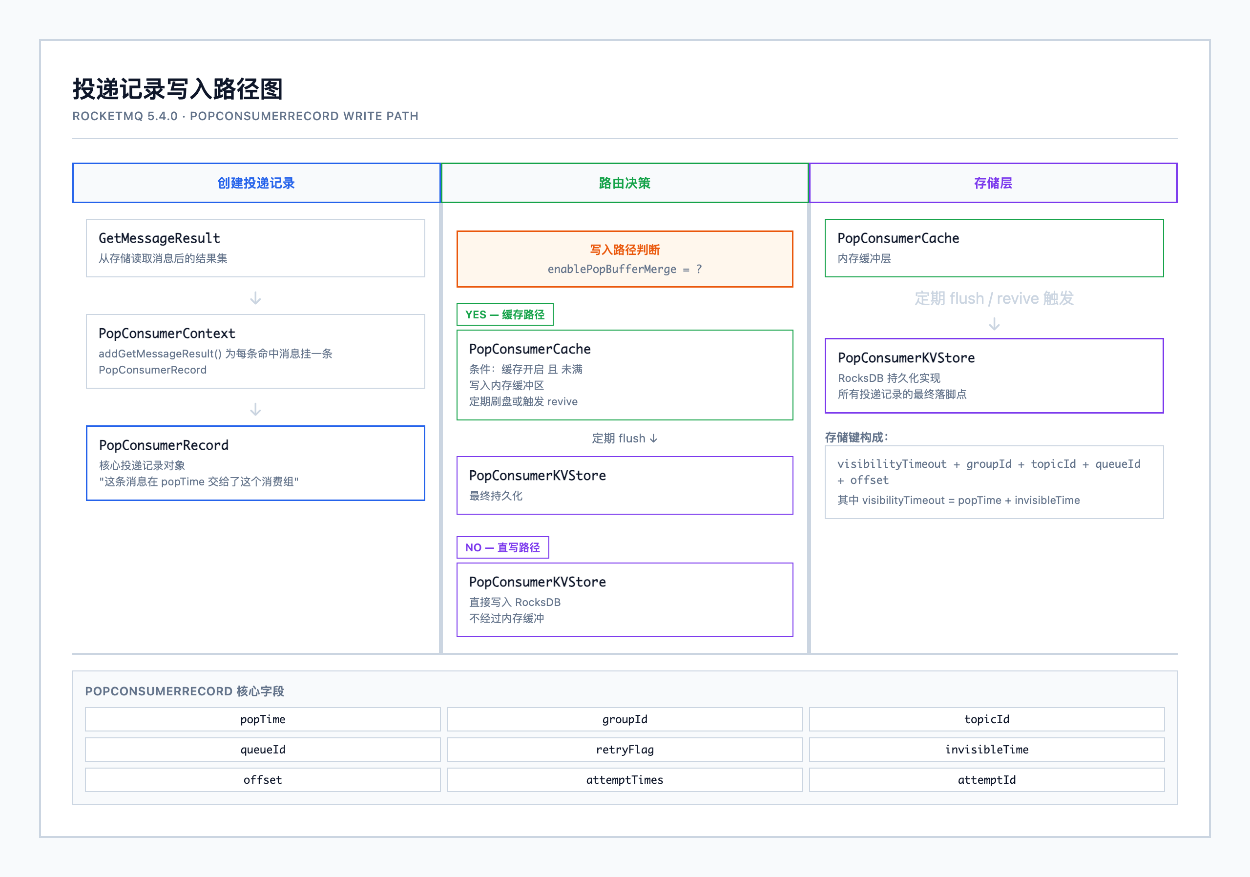 图注:PopConsumerRecord 从创建到持久化的完整写入路径。enablePopBufferMerge=true 时经内存缓冲刷盘,否则直写 RocksDB。存储键为 visibilityTimeout + groupId + topicId + queueId + offset。