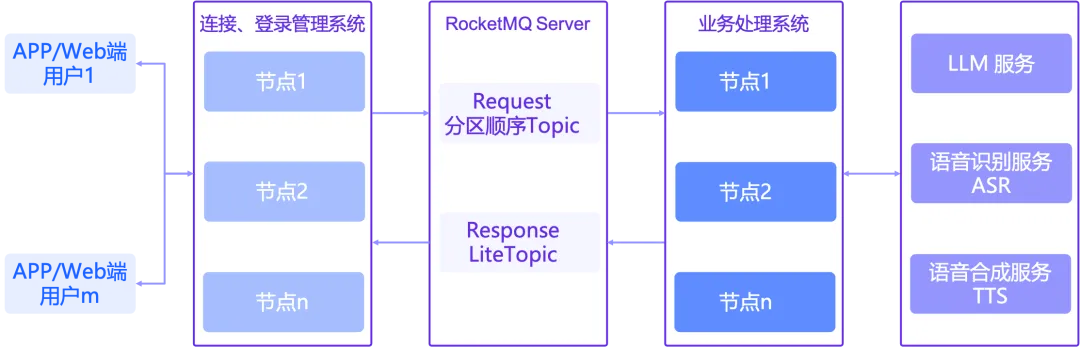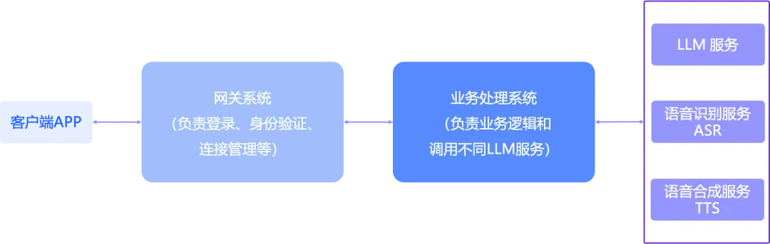 语音交互的消息流转路径通常贯穿:APP <-> Gateway <-> BizProcessSystem (Route) <-> LLM/ASR/TTS。其中,APP与 Gateway、BizProcessSystem与 LLM之间均维持着 WebSocket 长连接。