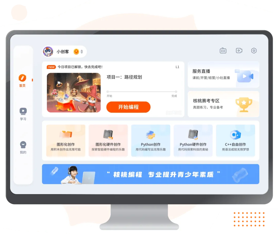 核桃编程是青少年编程教育行业的领先企业。自 2017 年 8 月成立以来,核桃编程通过打造智能实操产品与服务矩阵,发展成为了包含编程系列产品、编程硬件、赛级展服务、素质延展产品及数字出版物的多元化公司。在落实科学教育加法的实践之路上,核桃编程致力于提高青少年的科学素养,激发他们对学习的热爱,并以此培养未来科技创新人才。