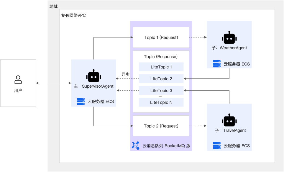 下图展示了一个基于 RocketMQ LiteTopic 实现的多智能体异步通信的典型流程,包含一个主智能体(Supervisor Agent)和两个子智能体(Sub-Agent)。