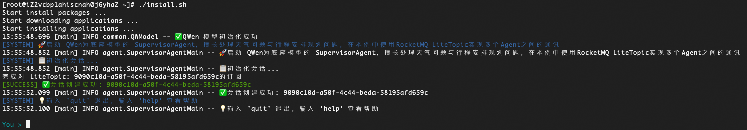 c. 部署智能体应用:远程连接云服务器 ECS 根据提供的执行脚本部署示例应用程序。等待应用启动完毕,大约需要 3~5 分钟,直到终端显示 You >提示符,便可直接在终端中输入信息与智能体交互。