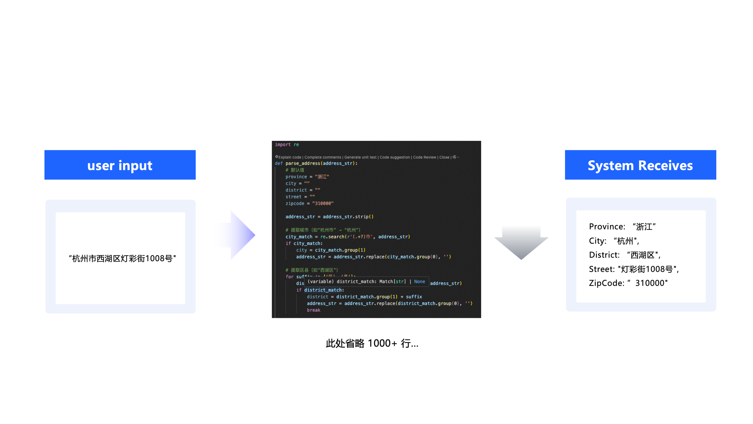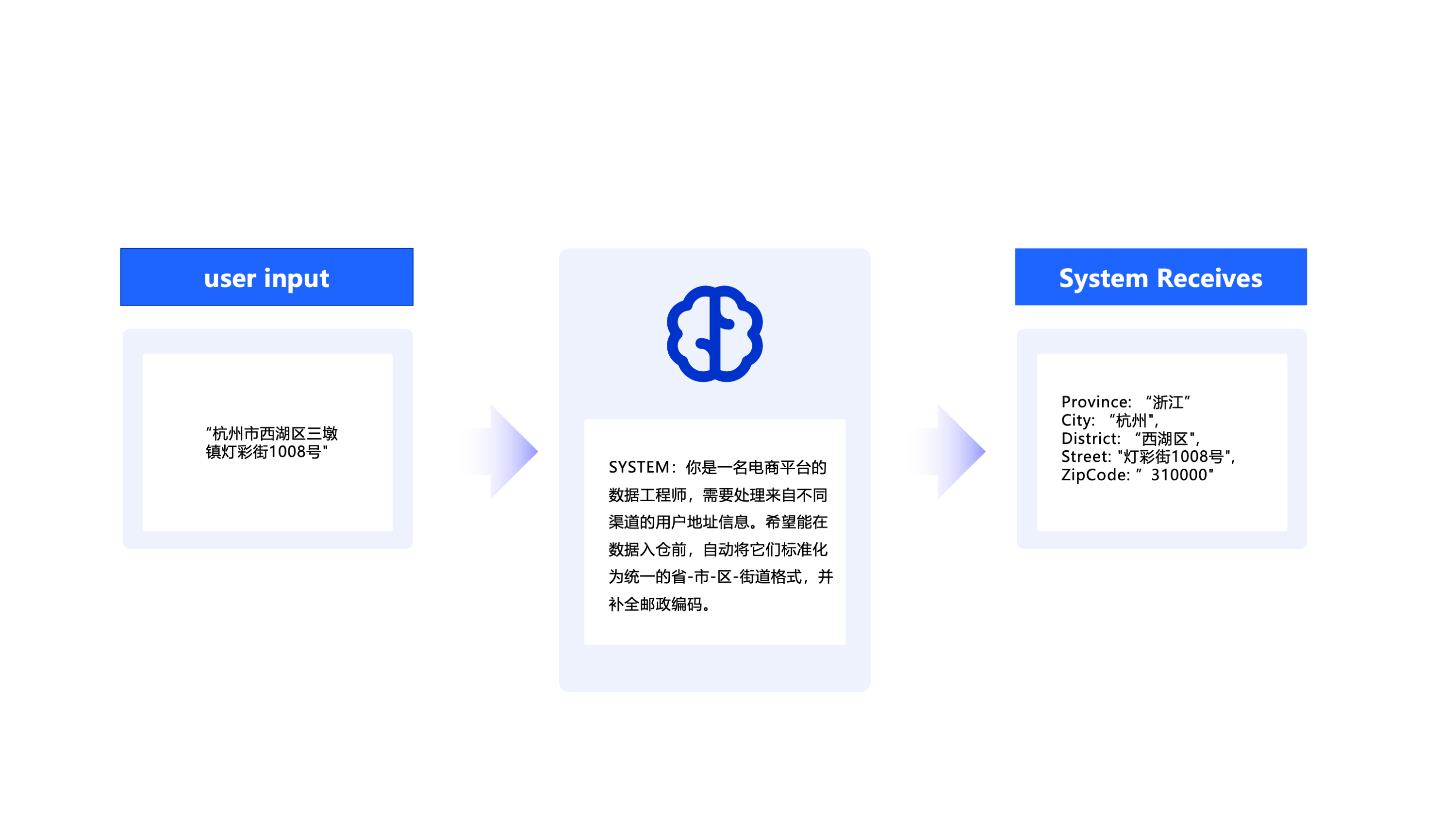 以一个常见的地址信息标准化场景为例。用户输入的地址格式五花八门,可能是文本、文档、扫描图片以及客服对话等。后端系统为了便于入库与分析,必须将这些信息精准地解析为“省-市-区-街道”的标准化结构。更棘手的是,原始地址信息还可能存在错别字、信息缺失或语义模糊等问题。在传统 ETL 模式下,工程师不得不编写数千行复杂的正则表达式和判断逻辑,并维护一个庞大的地址库。这种方式不仅开发和维护成本高、扩展性差,而且难以盖所有非标准格式和异常情况。