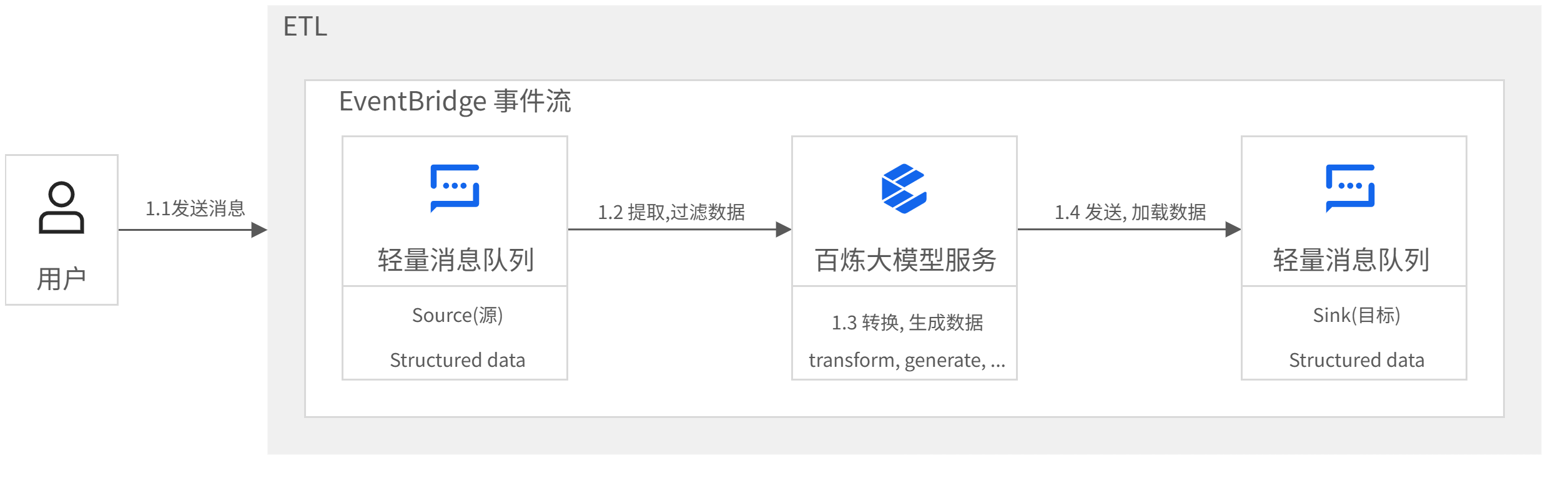 通过在 EventBridge 的事件流中原生集成百炼大模型服务,使开发者可以在数据流中直接调用 AI,从而轻松、高效地完成传统 ETL 中复杂的转换(Transform)任务。